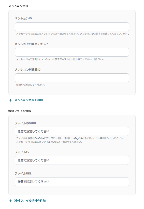 その他にも、メンション情報や添付ファイルの情報を入力・追加することもできます。