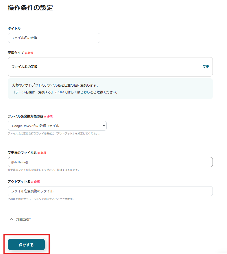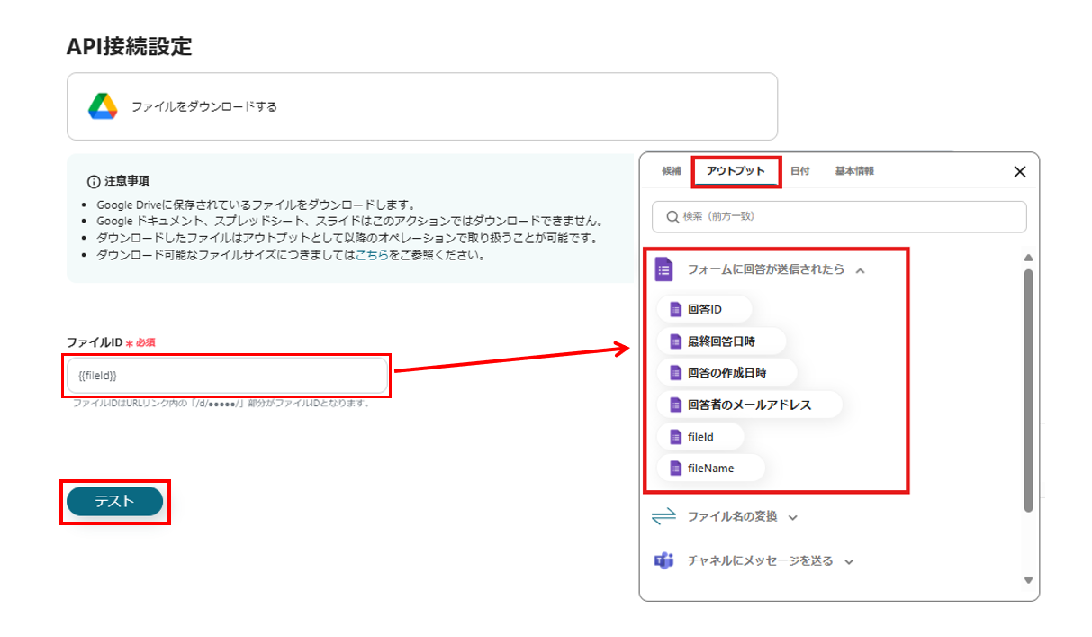 次へ進むと自動的にファイルIDに「{{fileId}}」が入力されてでてきます。