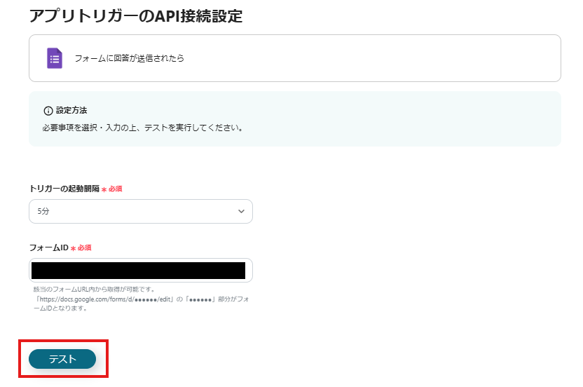 トリガーの起動間隔を設定し、フォームIDを入力して、テストをクリックしてください。