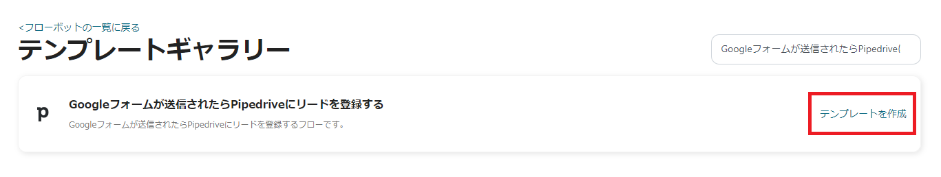 右上の検索窓に「Googleフォームが送信されたらPipedriveにリードを登録する」を入力して検索します。