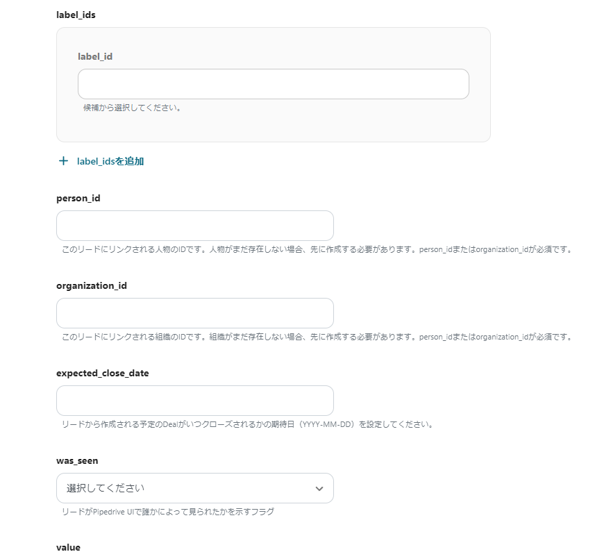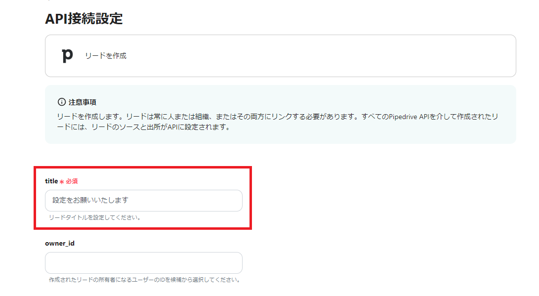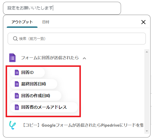 今回は設定されていませんが、例としてGoogleフォームの項目に「氏名」「会社名」などを作っておくと、Pipedriveのリード作成時のタイトルに利用できそうです。