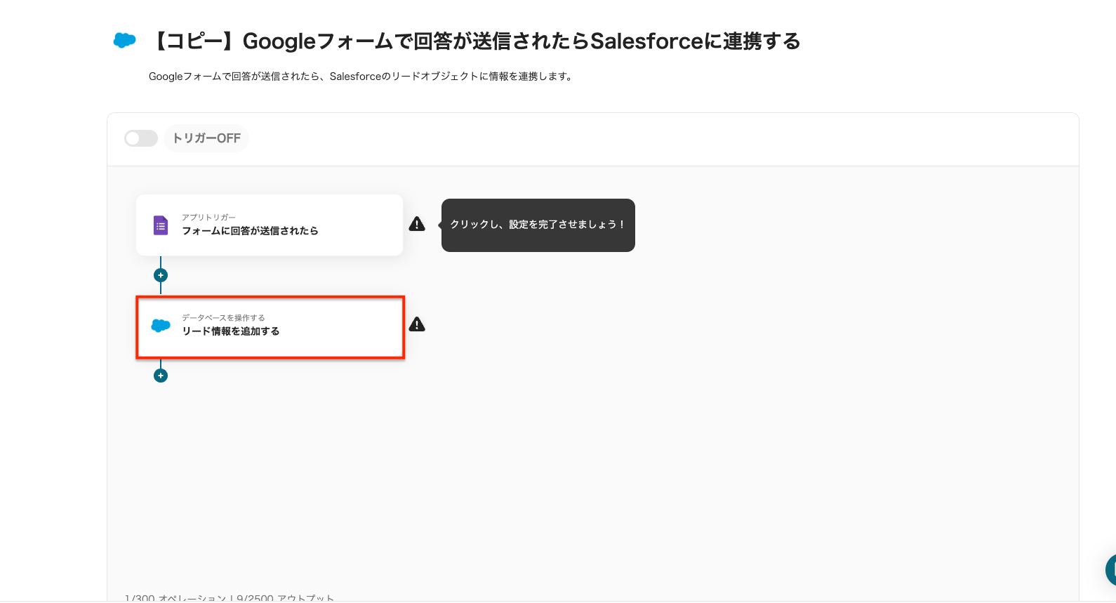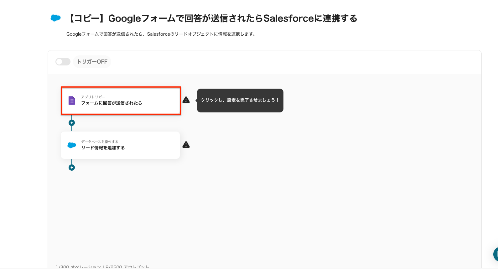 ※Salesforceはチームプラン・サクセスプランでのみご利用いただけるアプリとなっております。フリープラン・ミニプランの場合は設定しているフローボットのオペレーションやデータコネクトはエラーとなりますので、ご注意ください。