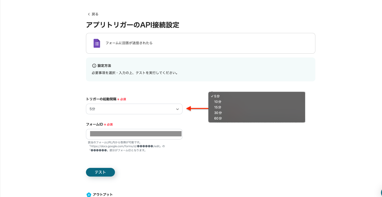 全て入力し終えたら、指定したフォームでテスト用の回答を送信してから「テスト」をクリックしてください。
