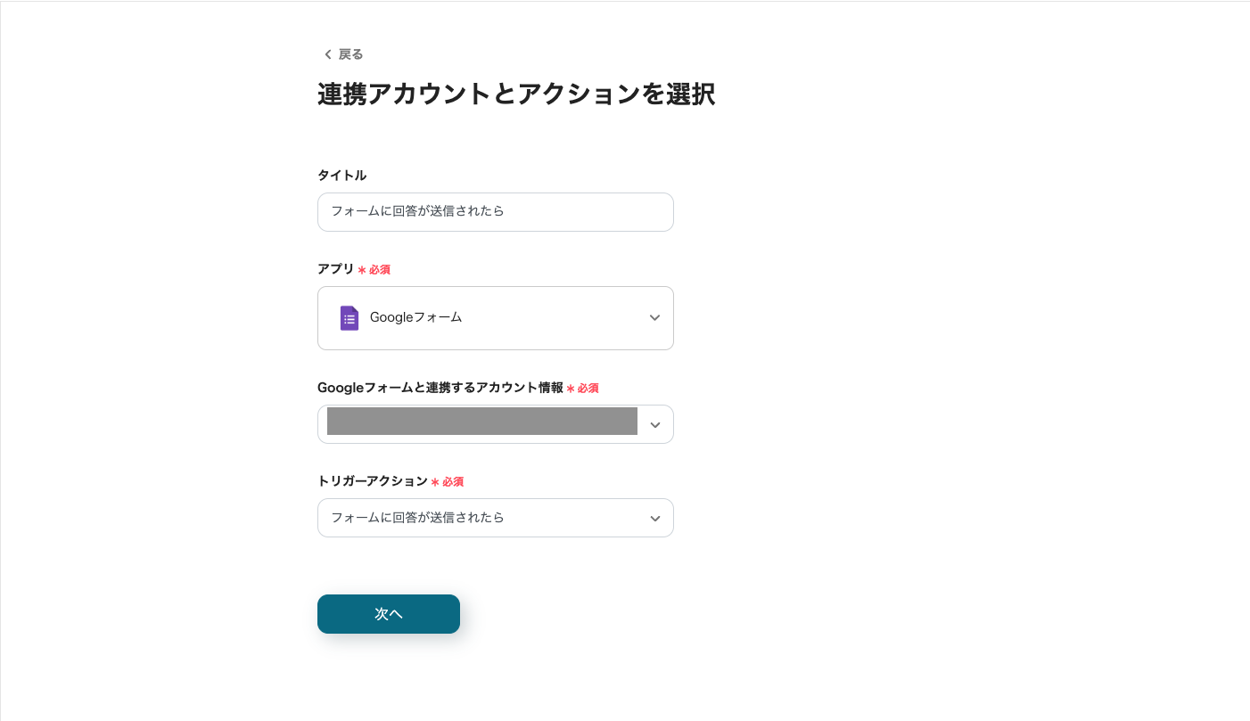 タイトルは編集可能ですが、トリガーアクションは変更せず「次へ」をクリックしてください。