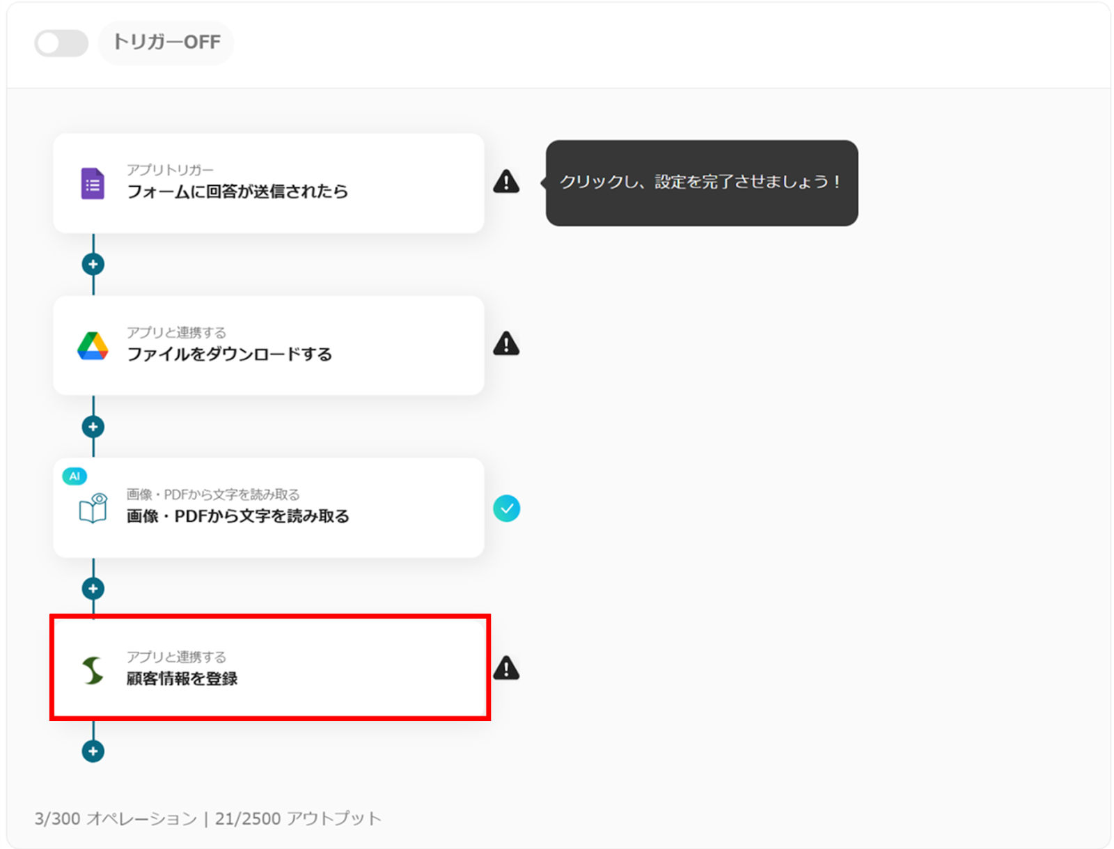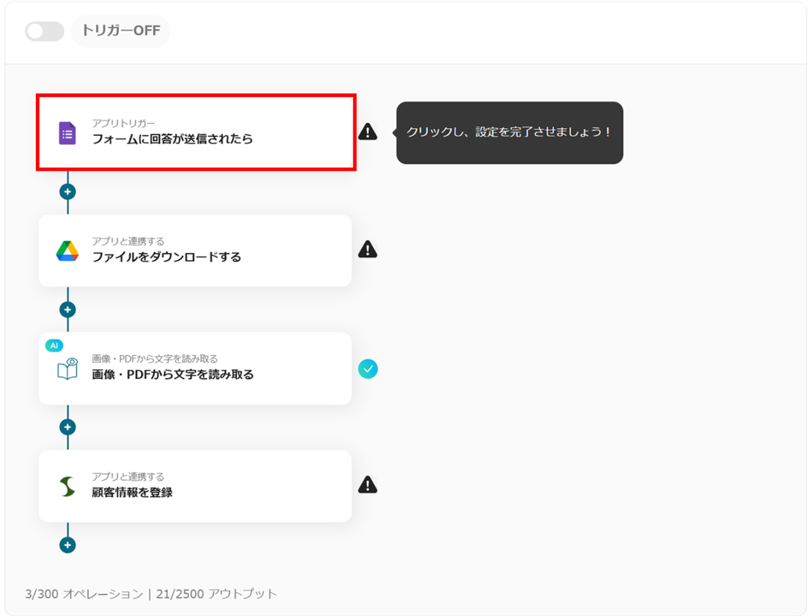 これで、「Googleフォームで送信された名刺画像をOCRで読み取りサスケに登録する」フローボットの完成です。