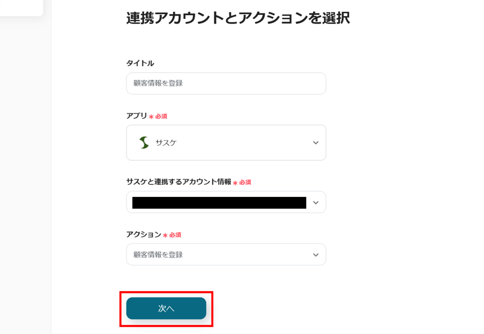 (2)サスケの「連携アカウントとアクションを選択」画面から、サスケと連携するアカウント情報に誤りがないかを確認し、アクションは「顧客情報を登録」のままで「次へ」をクリックします。
