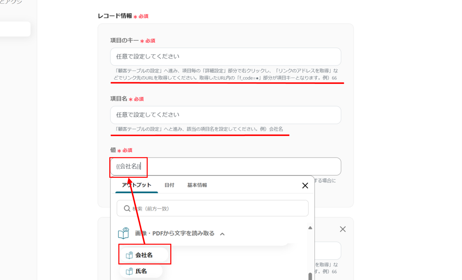下の画像のように設定することで、OCRで読み取った情報をサスケに登録できます。