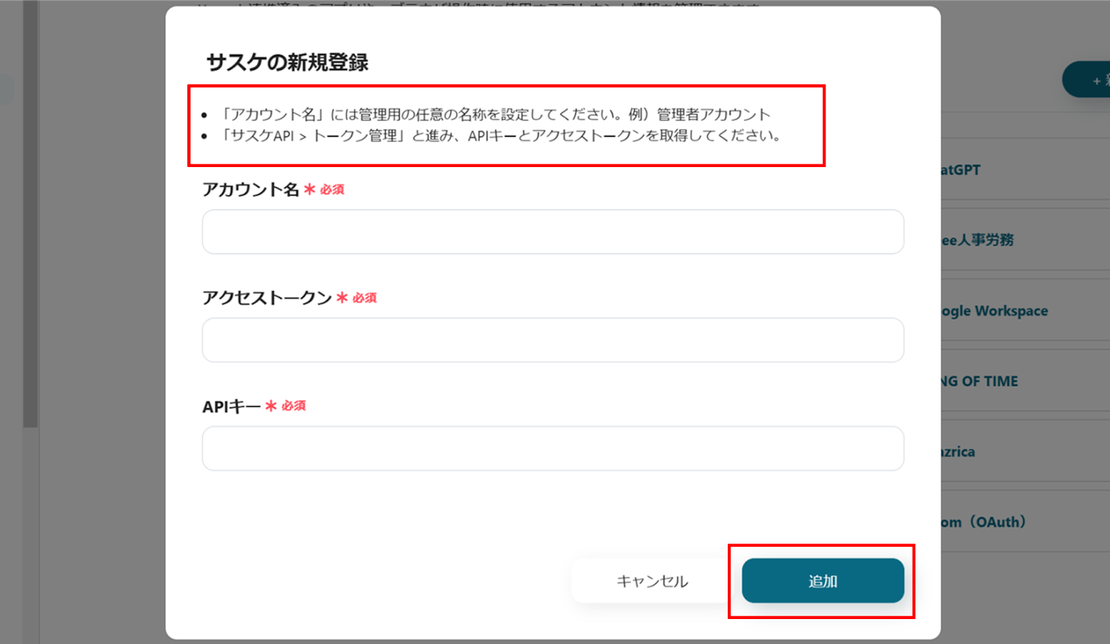 (6)「サスケの新規登録」画面から、赤枠を確認の上、アカウント名、アクセストークン、APIキーを入力し、「追加」をクリックします。