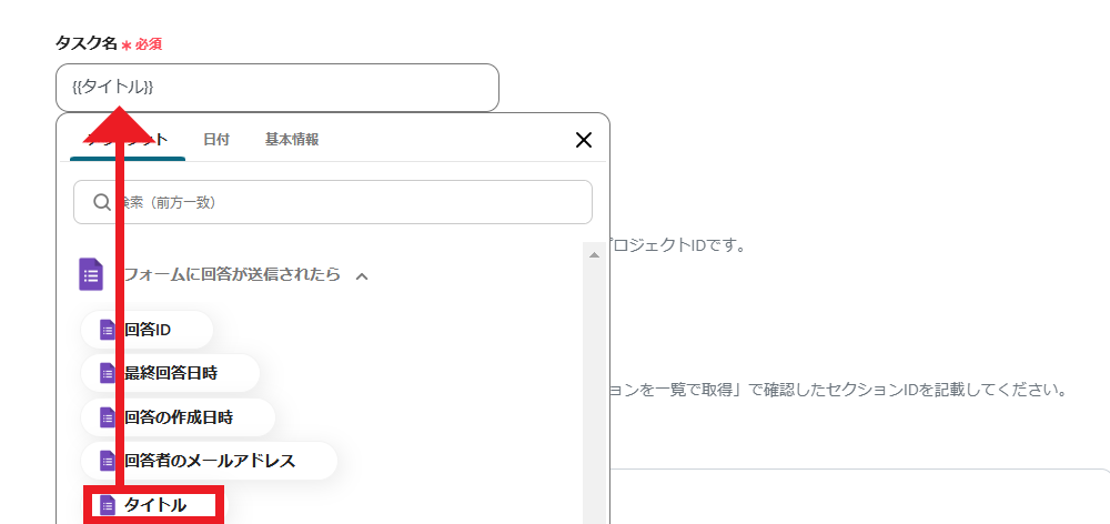 - Asanaでタスクを追加するアクションを設定する際に、タスク名やプロジェクトID、セクションIDなどを任意で設定してください。