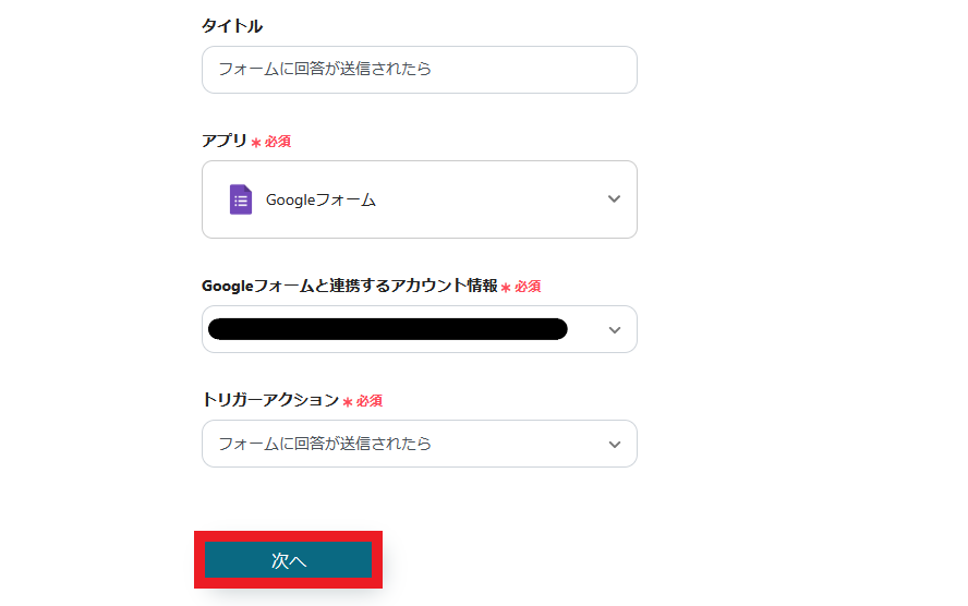 - 次に、トリガーでGoogleフォームを選択し、「フォームに回答が送信されたら」というアクションを設定し、対象のフォームを指定します。