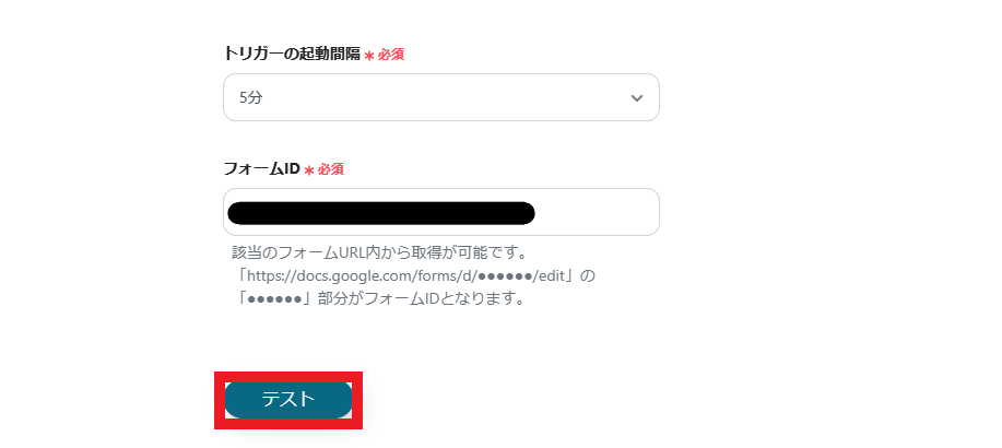 - Googleフォームのトリガー設定では、起動対象としたいフォームのIDを任意で設定してください。