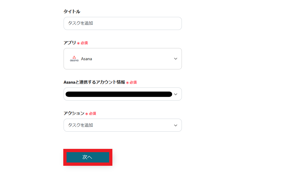 - 最後に、オペレーションでAsanaの「タスクを追加」アクションを設定し、抽出した情報を基にタスクを作成します。