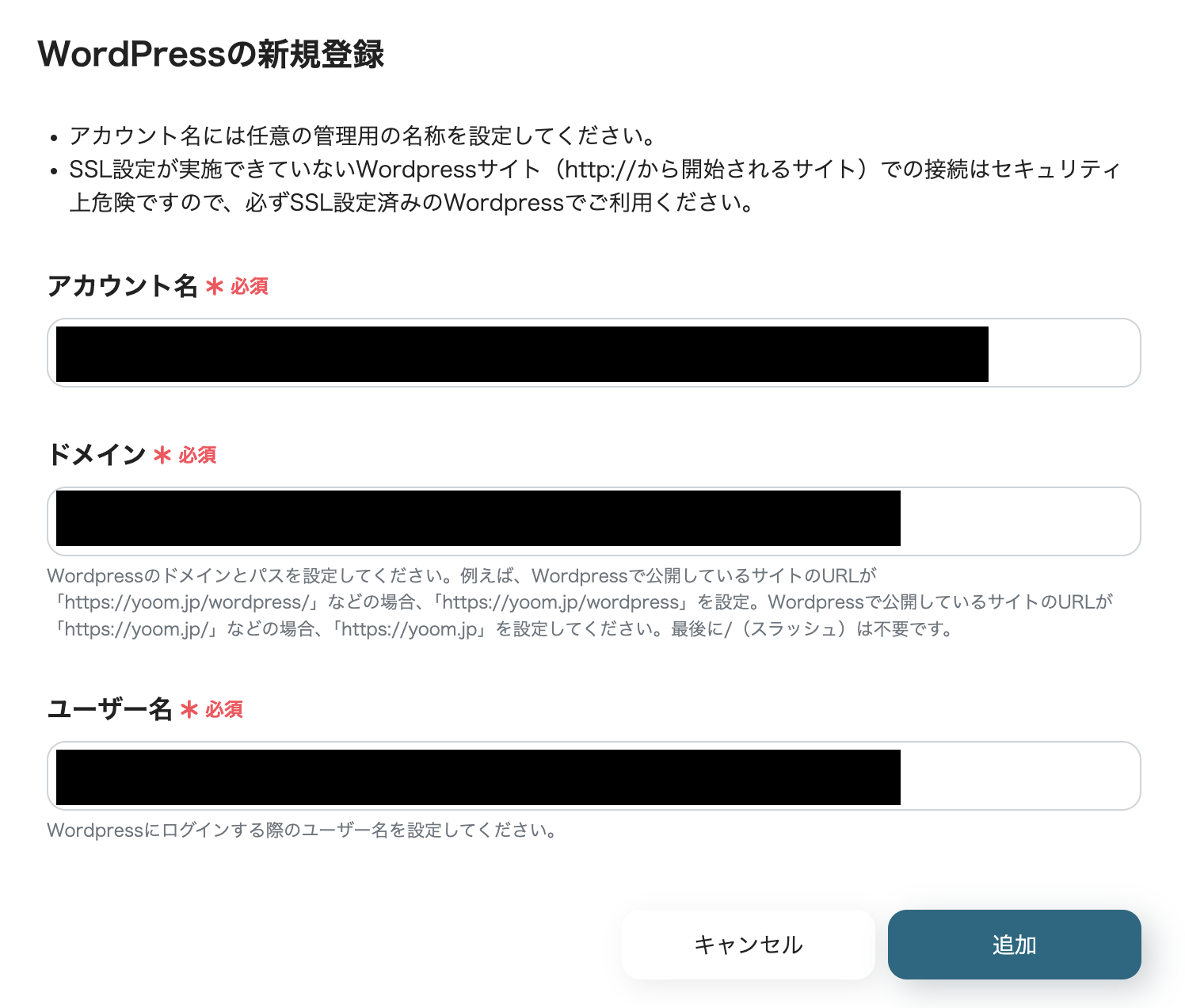 (2)連携するWordPressのアカウント情報を入力し、[次へ]をクリックします。