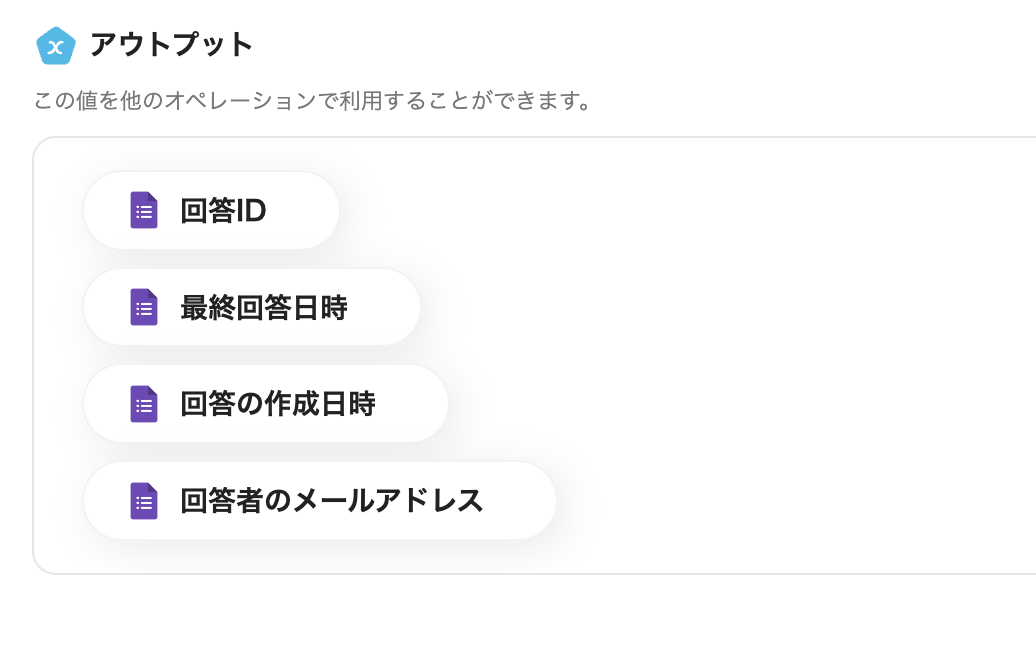 アウトプット情報は、「この値を他のオペレーションで利用することができます。」という注釈の通り、この後のステップで引用・活用できます。