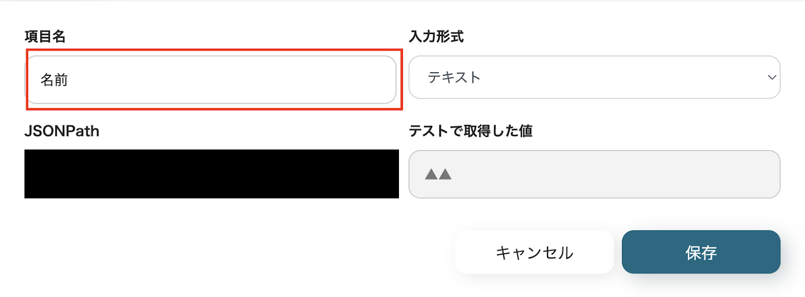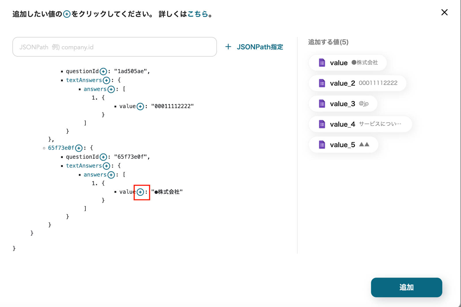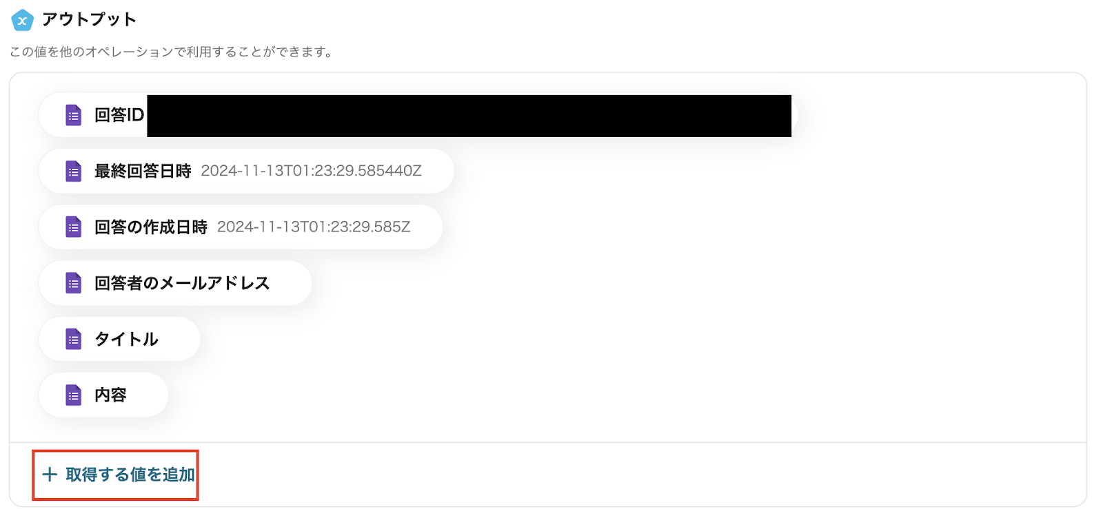 Googleフォームのアウトプットは「取得する値を追加」をクリックして手動で追加する必要があります。