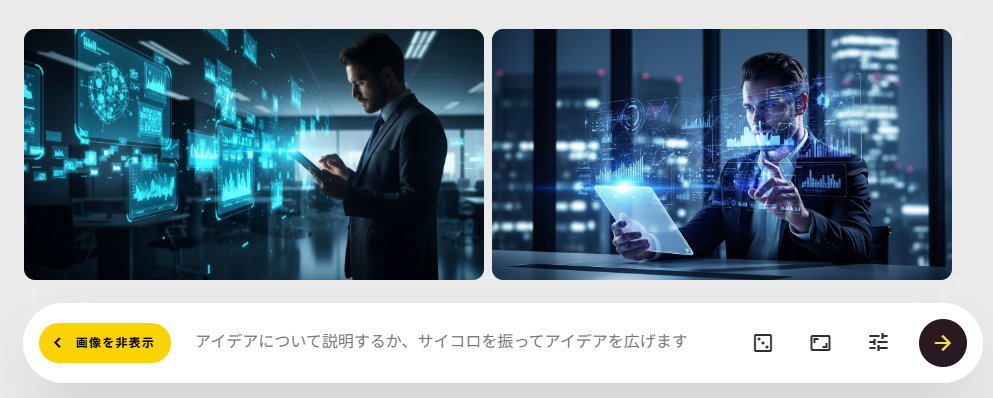 生成された2つのアイデアは、人物の角度やデータの浮遊感の表現がそれぞれ異なり、自分一人では思いつかなかったような具体的な構図のバリエーションを提示してくれます。