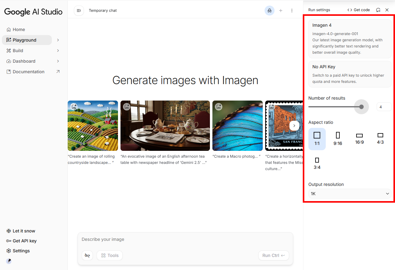 これらは対話を通じて素早くイメージを形にするのに適していますが、特定のImagenのバージョン(Imagen 4 Standardなど)を指定し、詳細なパラメータ(アスペクト比や解像度など)を操作したい場合は、開発者向けの環境である「Google AI Studio」を使用する必要があります。