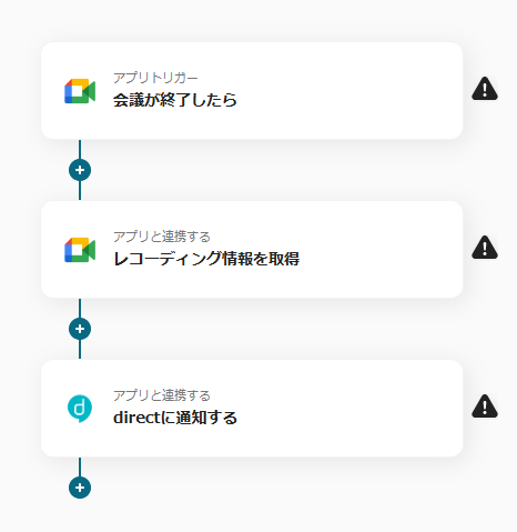 ※こちらの画面は、Yoomページ画面左側「マイプロジェクト」のフローボットで表示される、「【コピー】Google Meetで会議が終了したらdirectに通知する」をクリックすると表示されます。