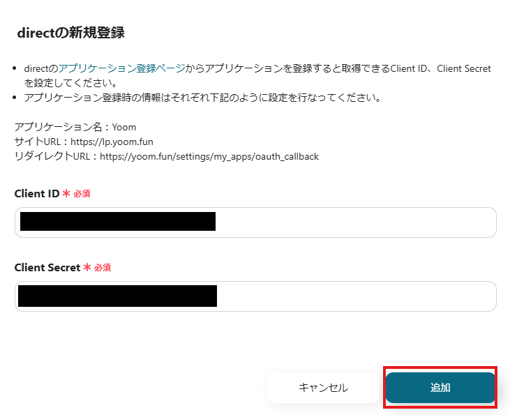 次の画面で、必須項目を入力し、「追加」をクリックします。