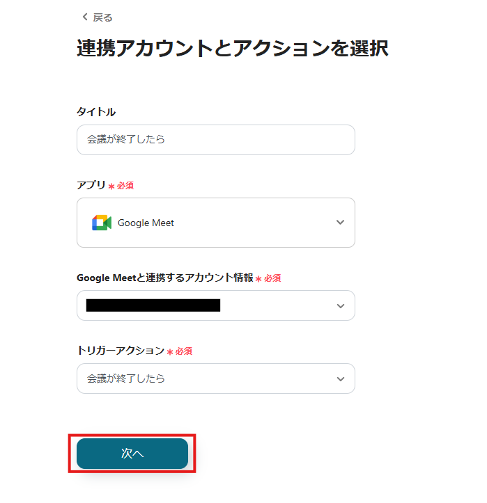 表示された画面で必須項目を入力し、「次へ」をクリックします。