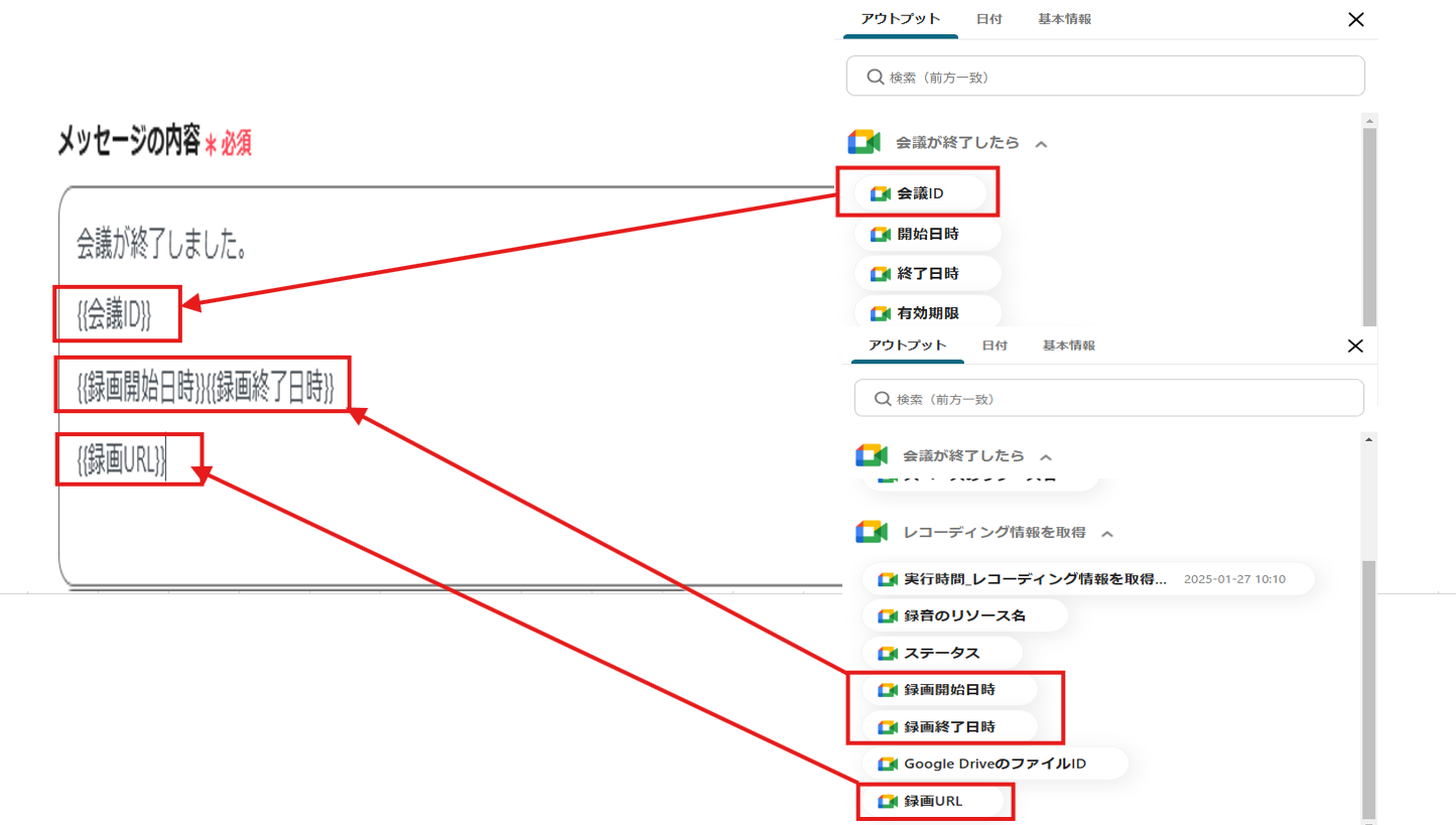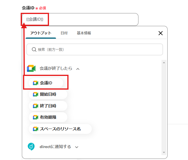 「会議ID」は、入力欄をクリックして表示されるアウトプットから選択してください。
