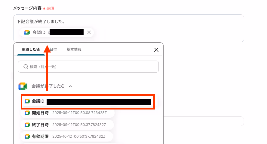入力バーをクリックすると、前ステップから取得したアウトプットも引用可能です。このようにアウトプットを引用することで、毎回異なる内容を通知できます。