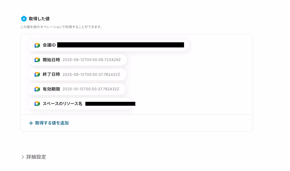 そのため、Google Chatで通知メッセージを設定する際、ここで取得した値を変数としてそのまま引用可能となります。