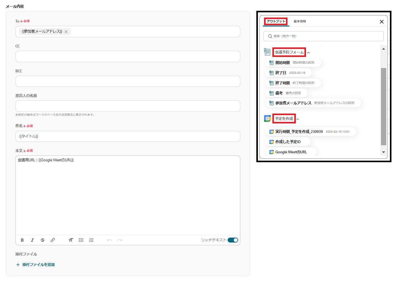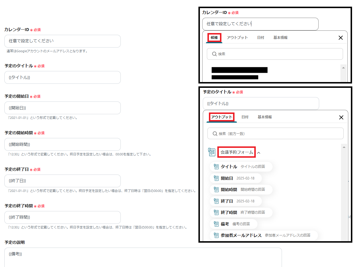※フォームに回答された内容を反映させる項目は、枠をクリックして表示されるアウトプットの「会議予約フォーム」から設定します。(値は二重括弧で表示されます)