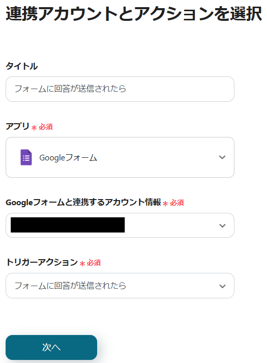 ・Googleフォームと連携するアカウントを確認し、「次へ」をクリックします。