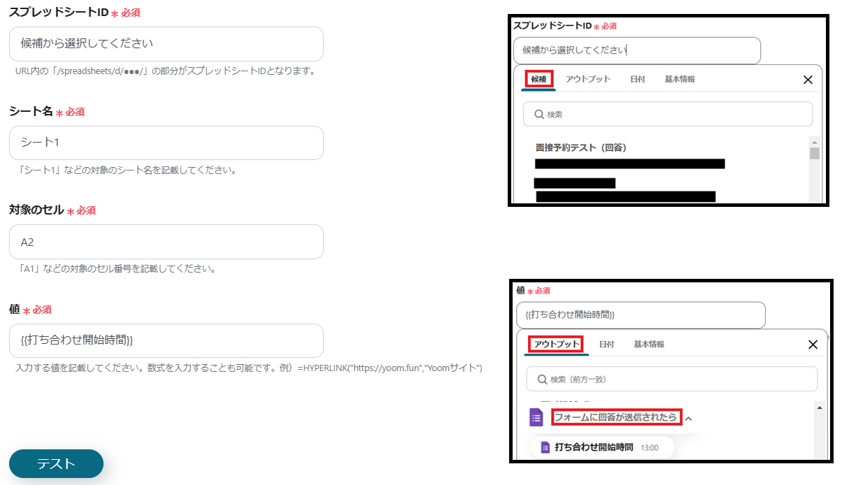 ※スプレッドシートIDとシート名は、枠をクリックして表示される「候補」から選択します。