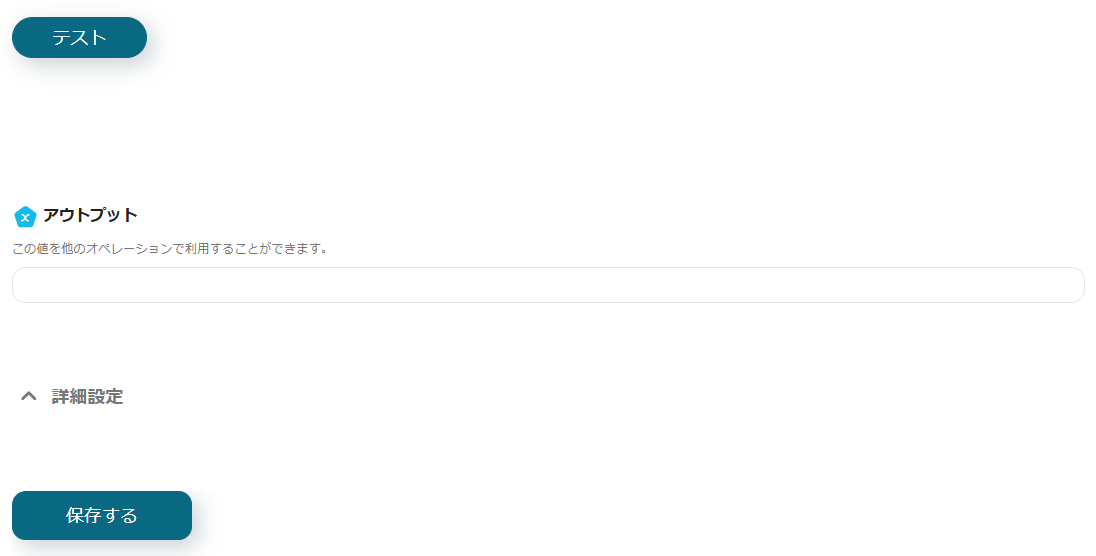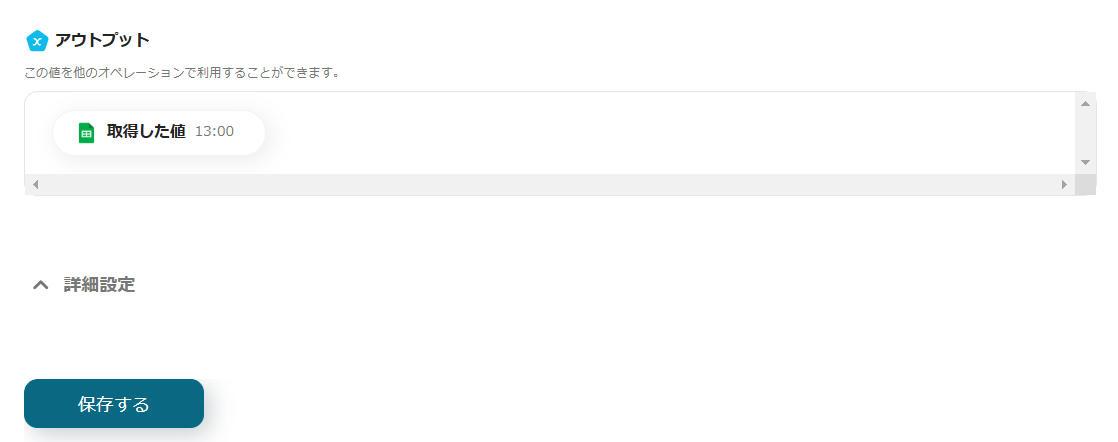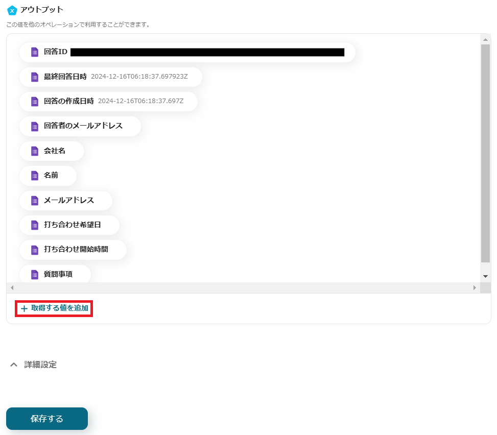 ・テストが成功したら、「+取得する値を追加」をクリックし、Googleフォームから取得した情報をアウトプットに追加して保存します。