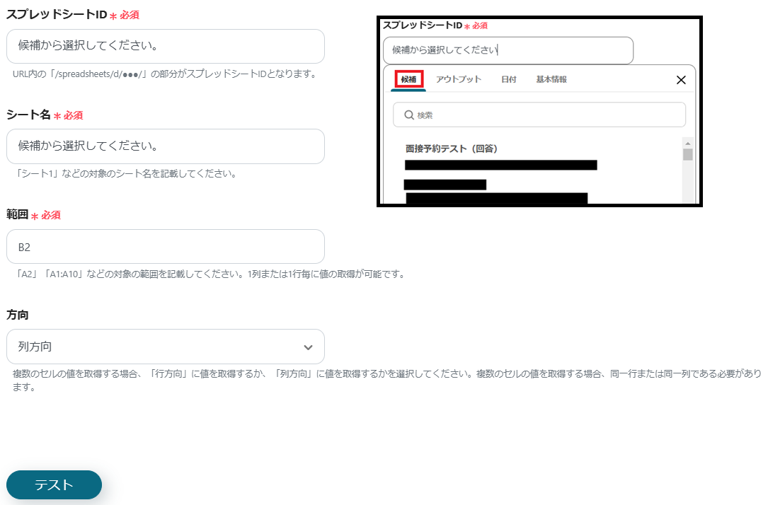 ※スプレッドシートIDとシート名は、枠をクリックして表示される「候補」から選択できます。