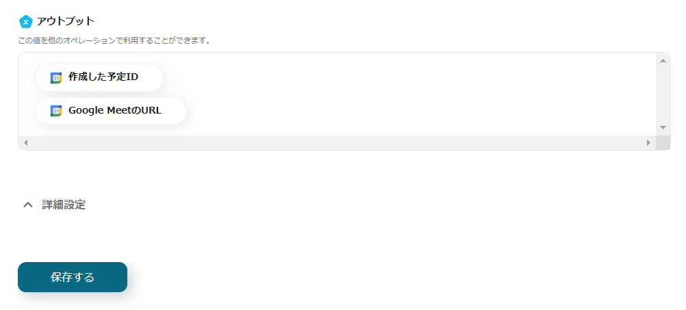 ※値には、Googleフォームのアウトプットから取得した「打ち合わせ開始時間」を設定します。(値は二重括弧で表示されます)