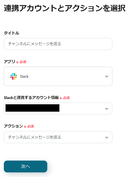 ・Slackと連携するアカウントを確認し、「次へ」をクリックします。