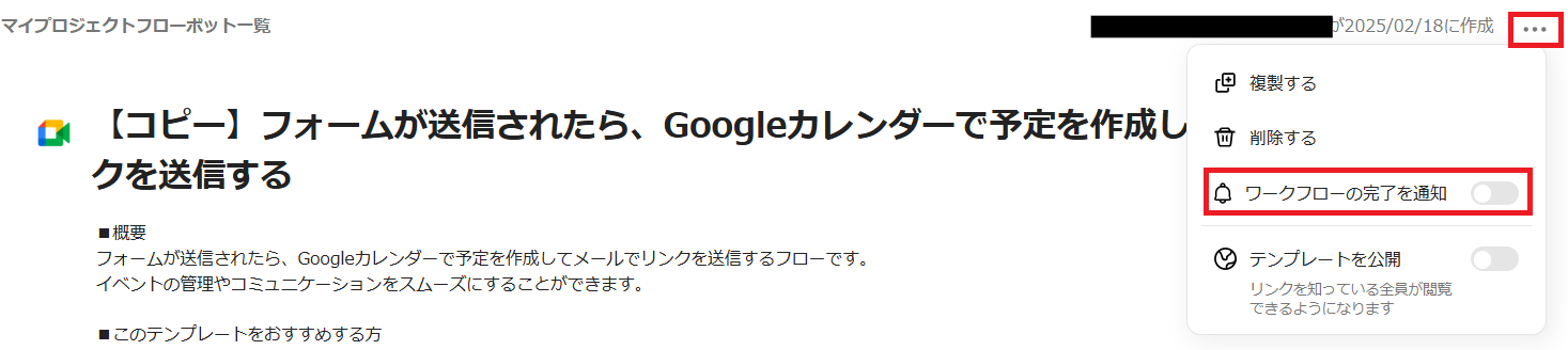 設定方法は簡単で、フローボットを設定する画面右上の「...」をクリックし、「ワークフローの完了を通知」をONにすると完了です。
