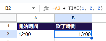 ※Googleフォームに送信された会議開始時間をもとに終了時間を取得する設定を、Google スプレッドシートの関数を用いて行います。今回は開始から1時間後を終了時間とする関数を下記のように設定しています。関数の設定次第では30分や1時間以上の設定も可能です。