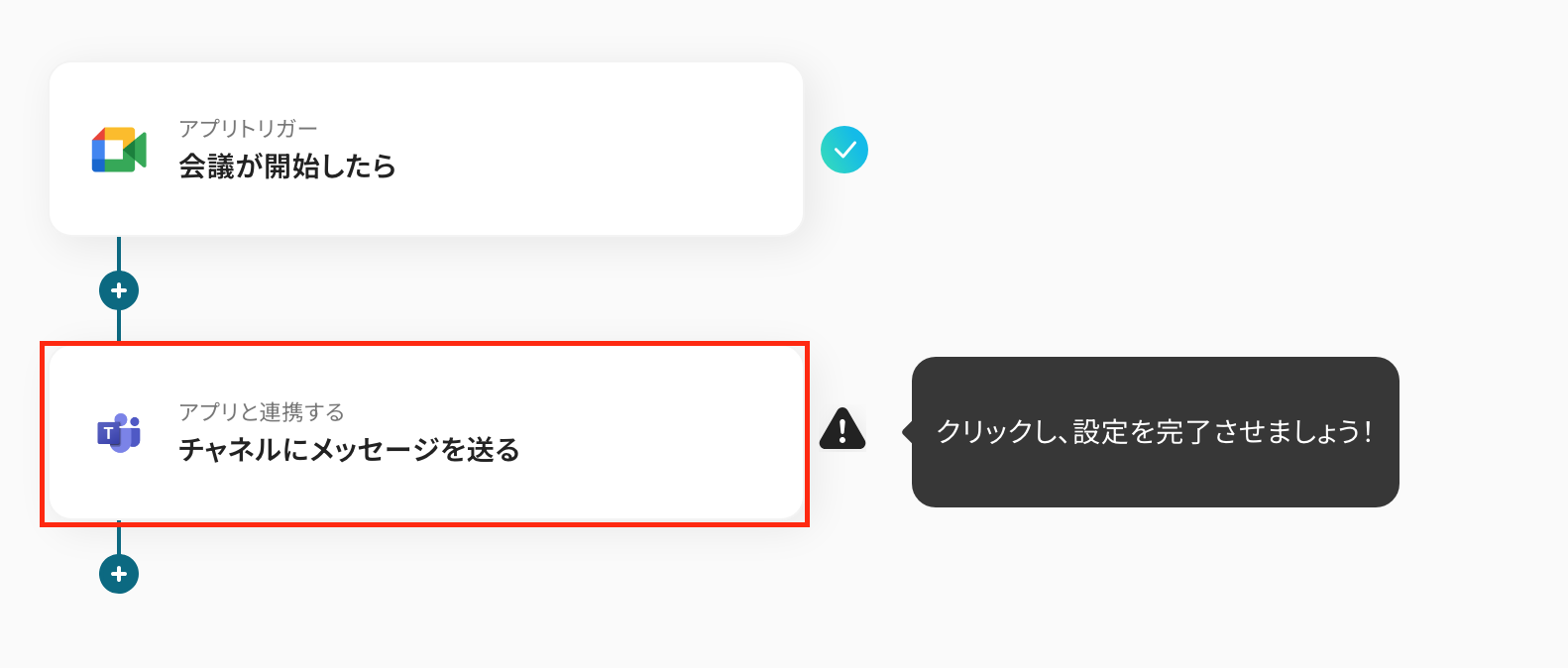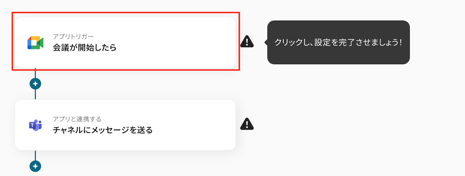 1.はじめに、Google MeetとMicrosoft TeamsをYoomと連携します。 2.次に、トリガーでGoogle Meetを選択し、「会議が開始したら」というアクションを設定します。 3.最後に、オペレーションでMicrosoft Teamsを選択し、「チャネルにメッセージを送る」アクションを設定して、会議の開始を通知します。 ※「トリガー」:フロー起動のきっかけとなるアクション、「オペレーション」:トリガー起動後、フロー内で処理を行うアクション