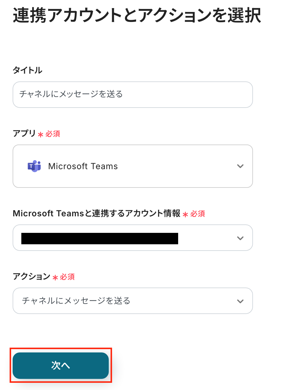 3.Microsoft Teamsの「チャネルにメッセージを送る」というオペレーションで、連携アカウントや送信先のチャットルーム、メッセージ内容を設定してください。