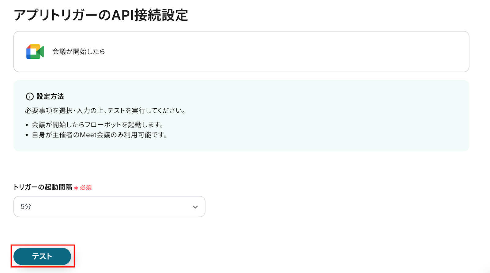 AirtableとGoogle MeetのそれぞれとYoomを連携してください。 トリガーは5分、10分、15分、30分、60分の間隔で起動間隔を選択できます。 プランによって最短の起動間隔が異なりますので、ご注意ください。