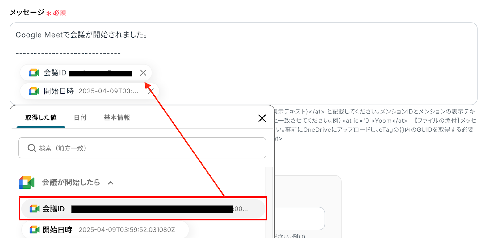 「メッセージ」の項目では、Microsoft Teamsへ通知する際の内容を設定します。ボックスをクリックし、情報を挿入します。 ※以下の画像のように取得した値から選択することで、Google Meet の情報を引用することができます。