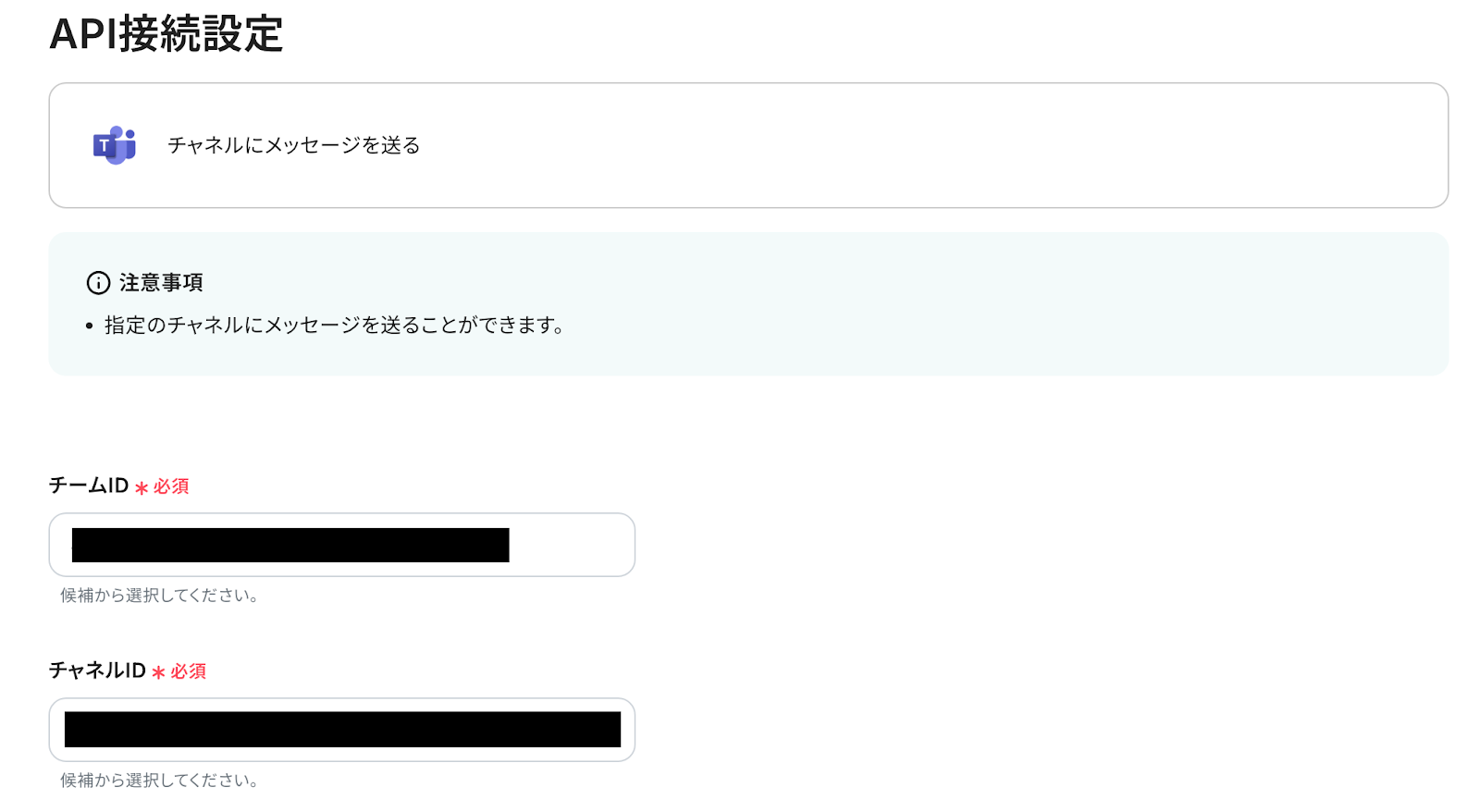 次に進むと以下の画面が表示されます。 ここではAPI接続設定をします。「チームID」や「チャンネルID」は、入力バーをクリックして表示される候補から選択ができます。