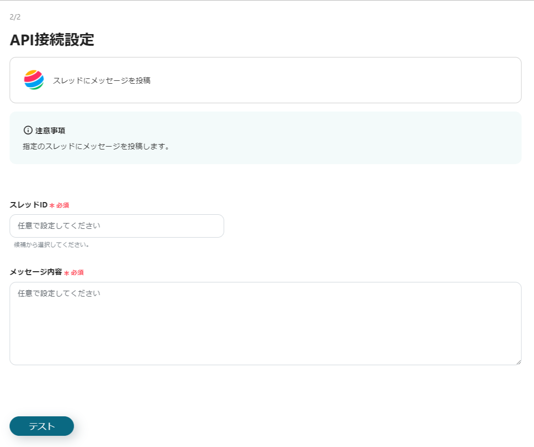 設定後「テスト」をクリックして、指定したスレッドにメッセージが投稿されるかを確認しましょう。