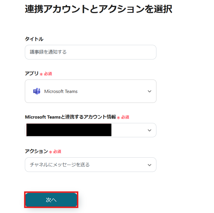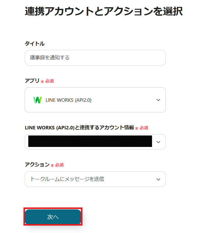 2) アクションは「議事録を通知する」を選択して、「次へ」をクリックします。