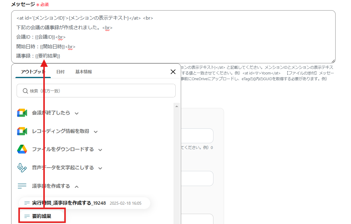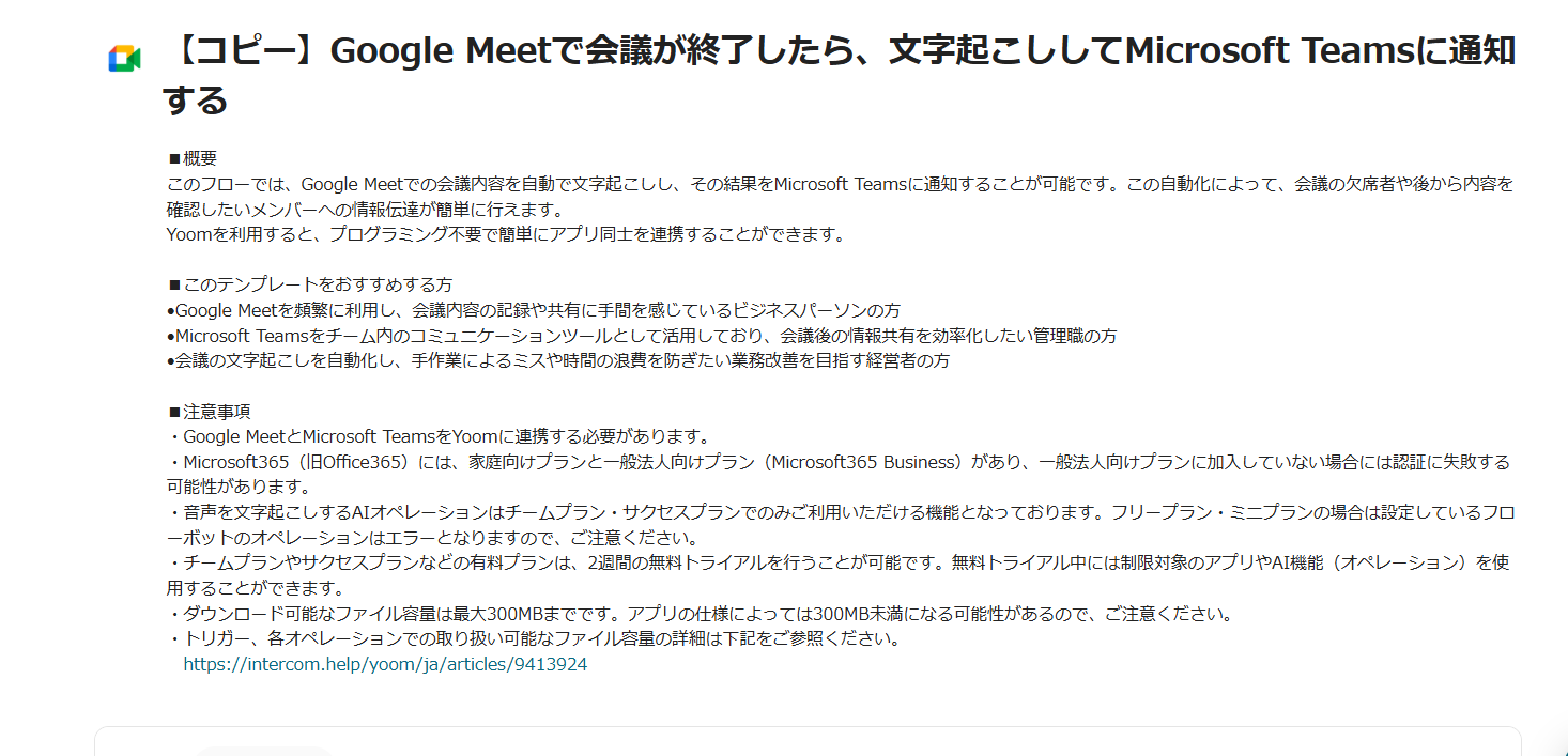 このテンプレートは、Google Meetの会議が終了すると、自動で文字起こしを行い、その内容をMicrosoft Teamsに通知する仕組みです。