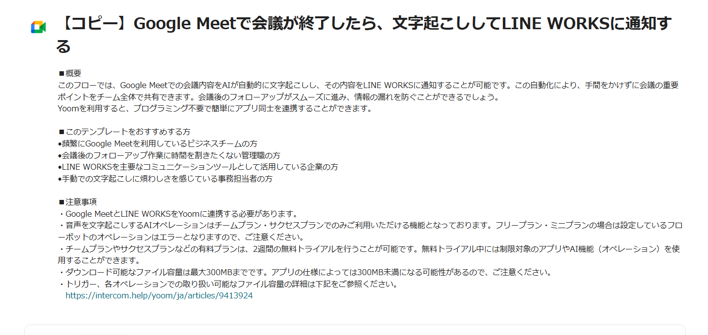 このテンプレートは、Google Meetの会議が終了すると、自動で文字起こしを行い、その内容をLINE WORKSに通知する仕組みです。