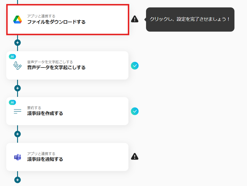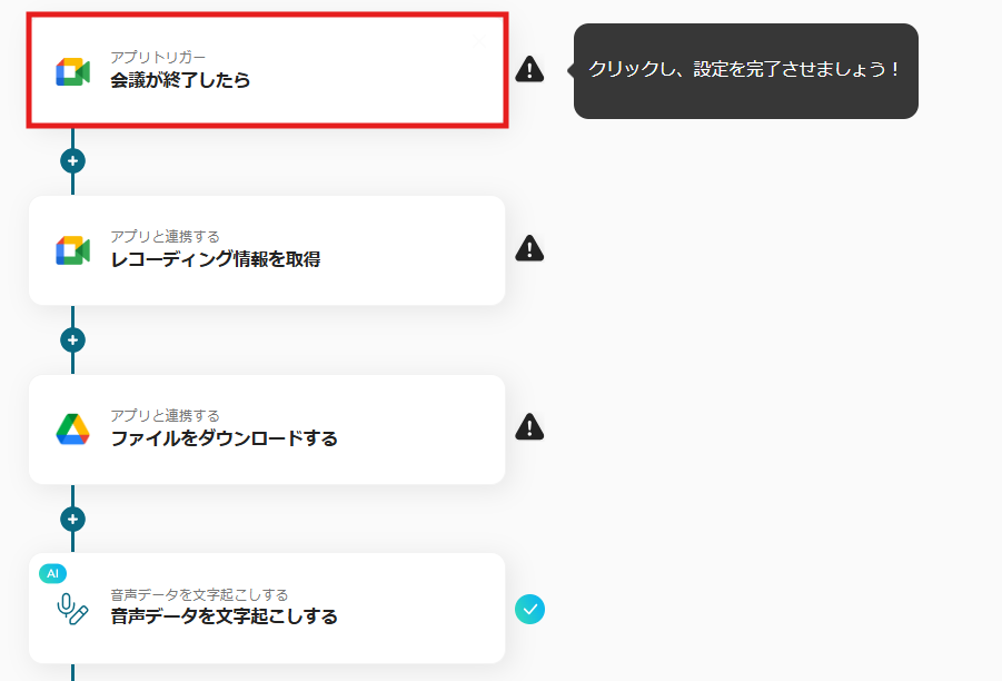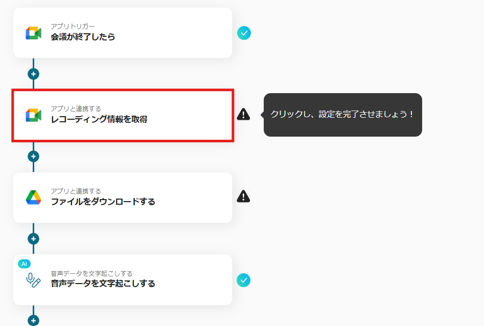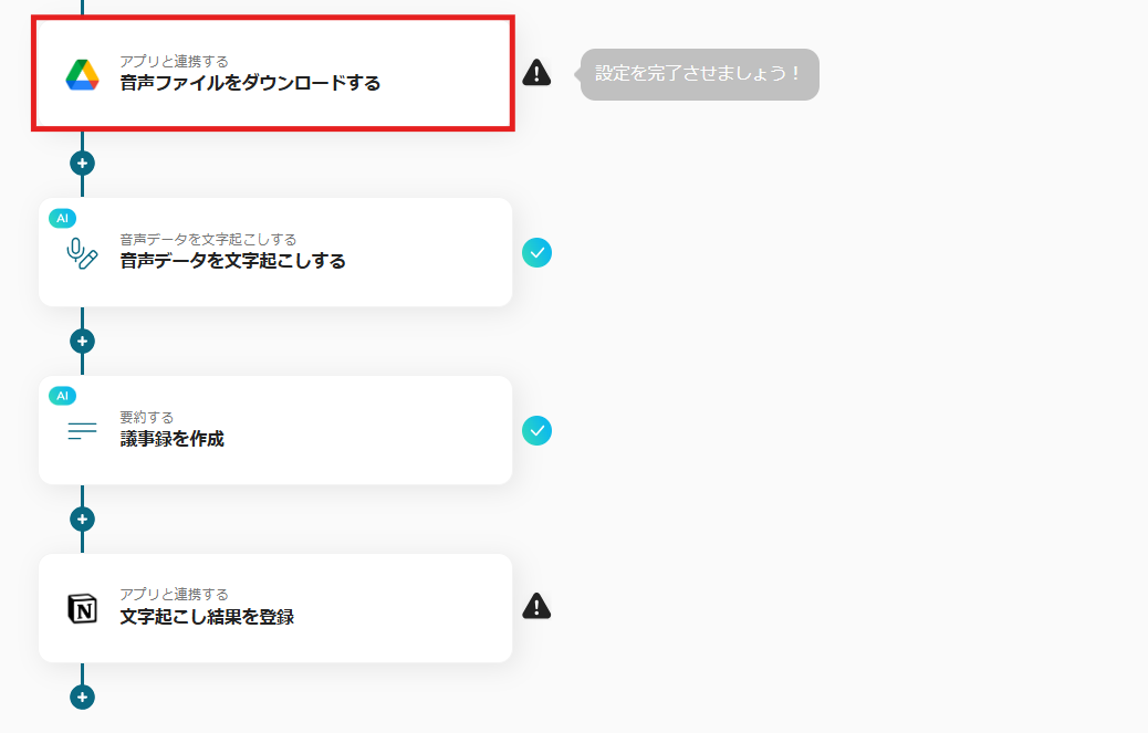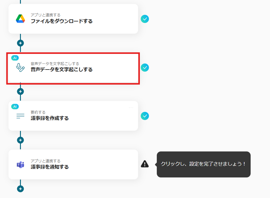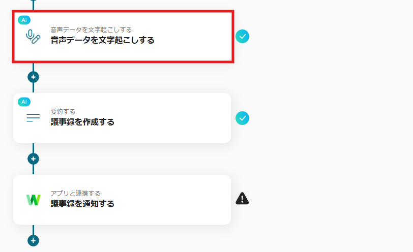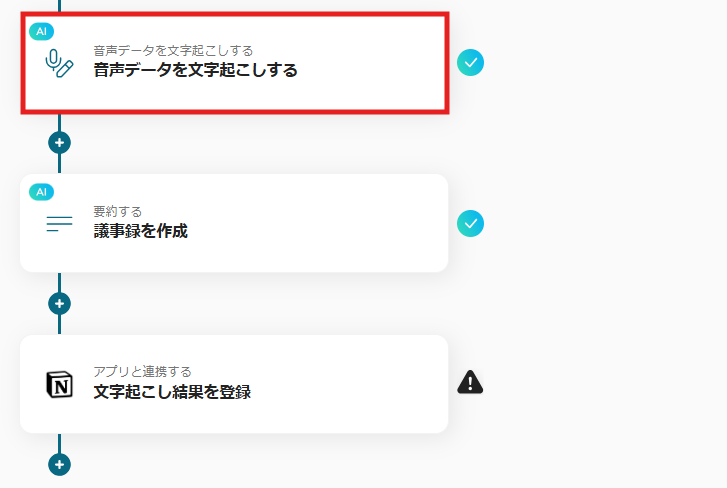 1) フローに戻り、「音声データを文字起こしする」のアイコンをクリックします。