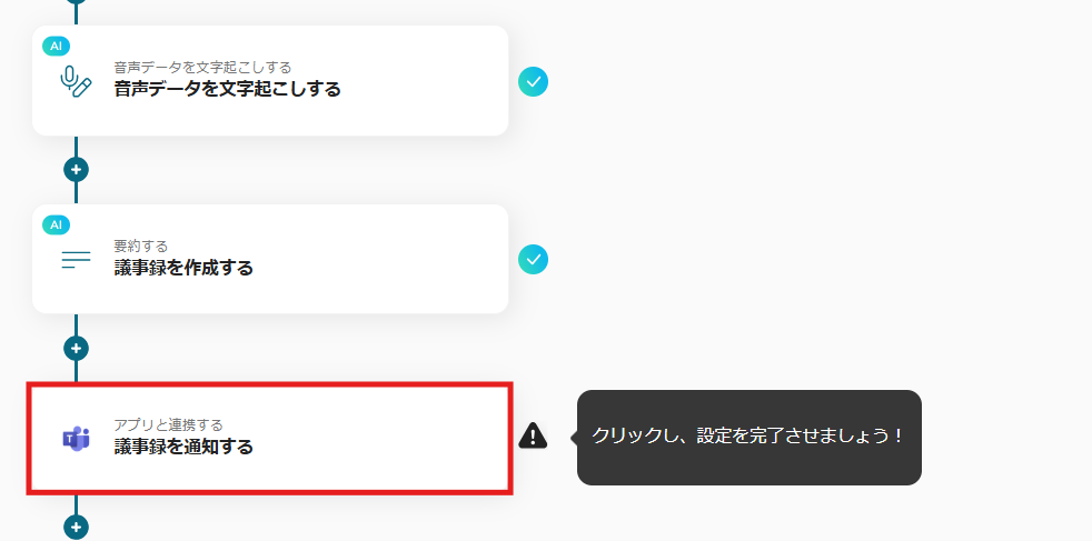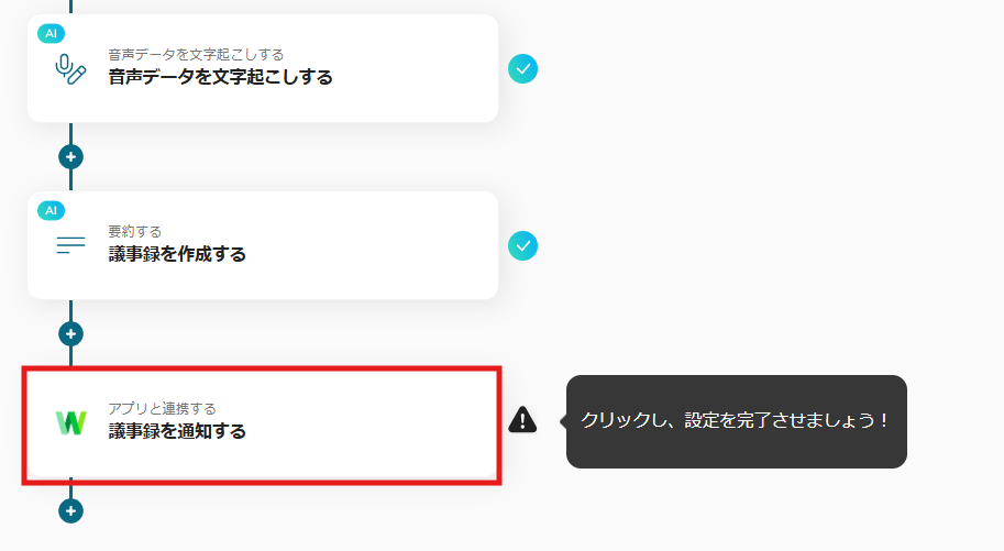 1) フローに戻り、「アプリと連携する 議事録を通知する」のアイコンをクリックします。