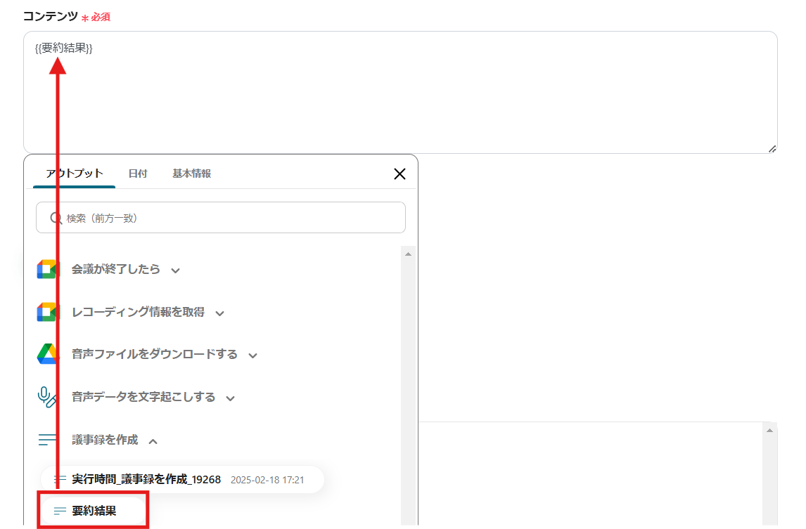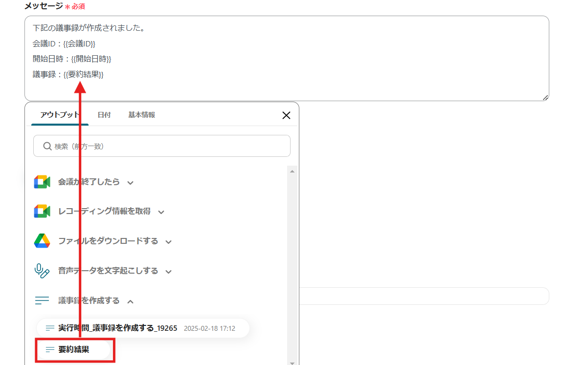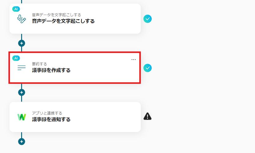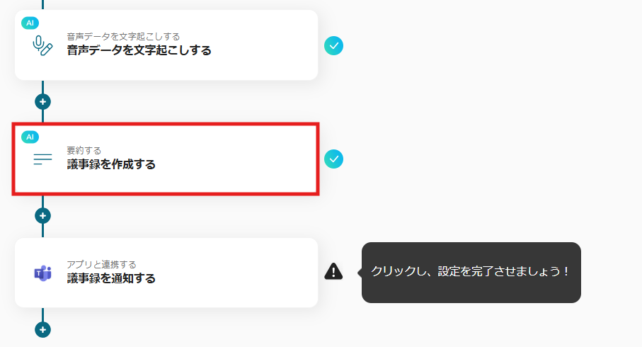 1) フローに戻り、「要約する 議事録を作成する」のアイコンをクリックします。