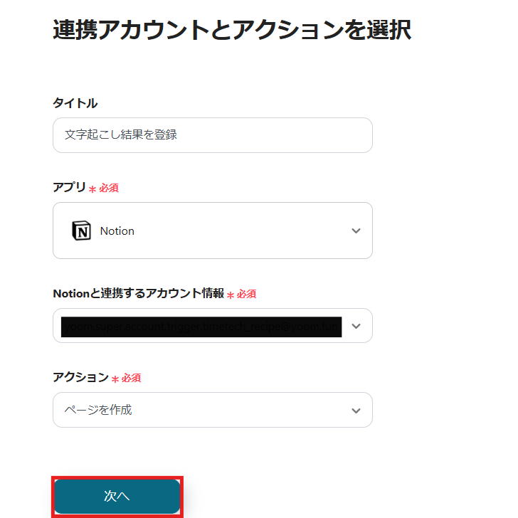 2) アクションは「文字起こし結果を登録する」を選択して、「次へ」をクリックします。