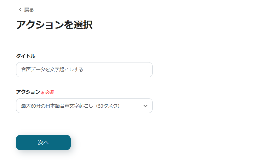 2) アクションは「最大60分の日本語音声文字起こし(50タスク)」を選択し、「次へ」をクリックします。